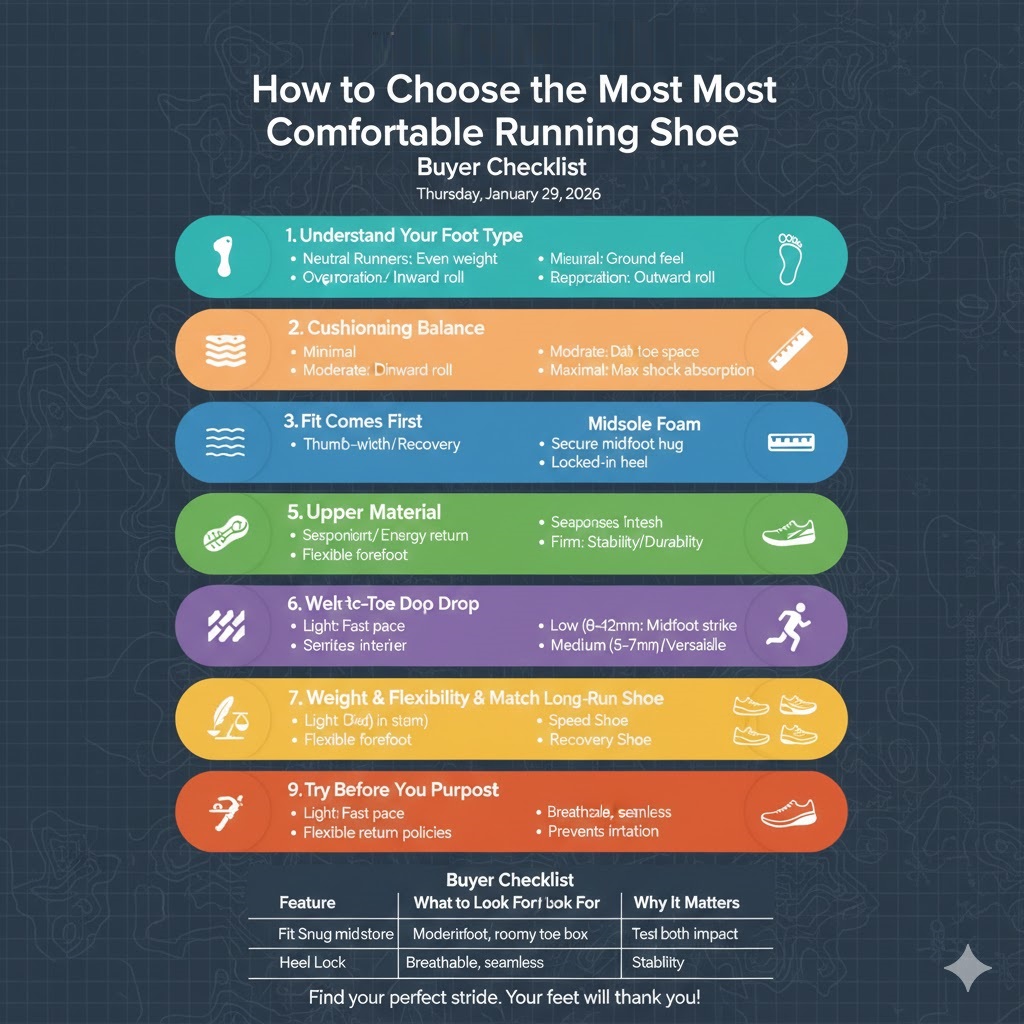 This guide breaks down exactly how to choose the most comfortable running shoe, step by step. Whether you’re a beginner, a daily jogger, or a long-distance runner, this buyer checklist will help you make a smart, injury-free decision.