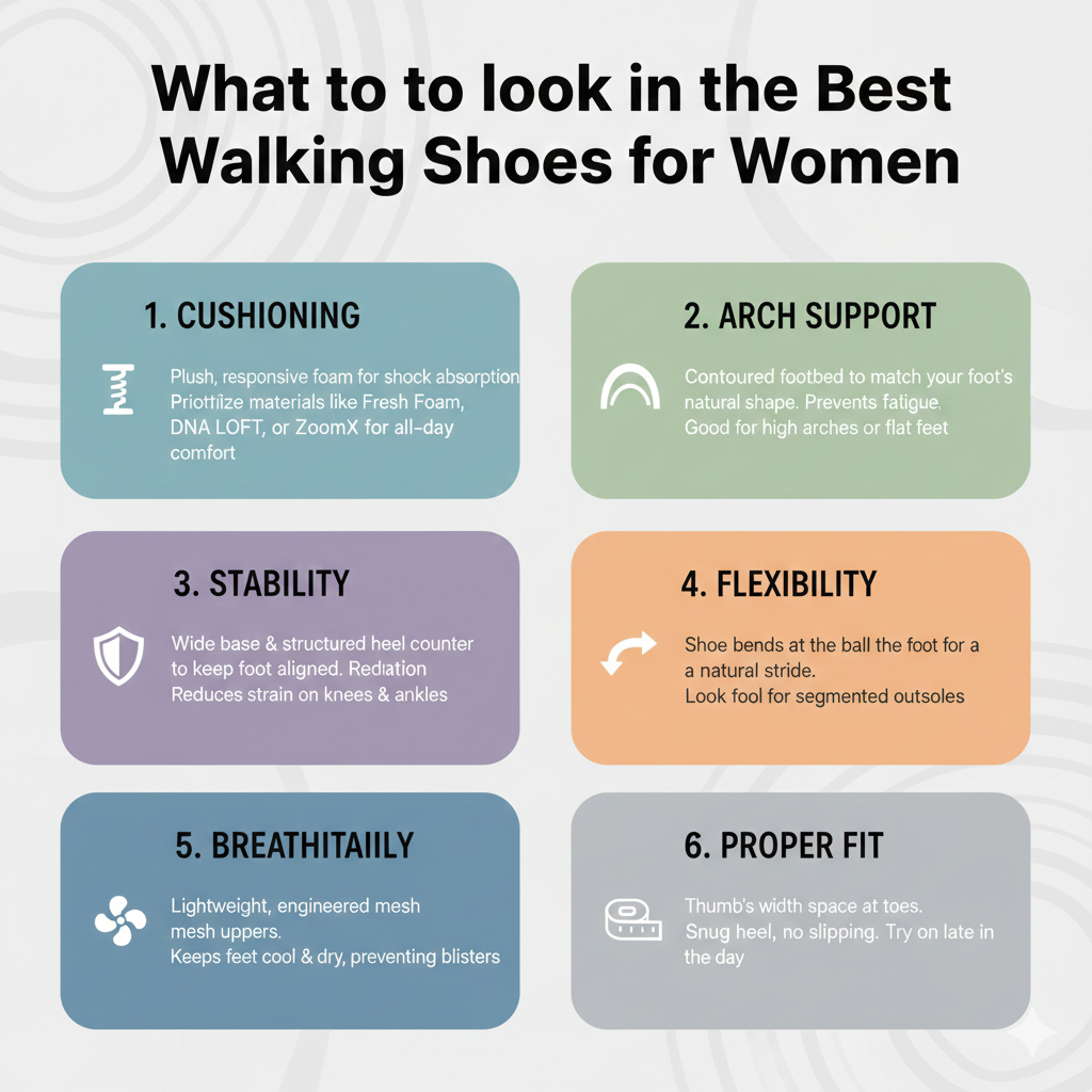 Proper arch support is crucial, especially for women with flat feet, high arches, or who are prone to conditions such as plantar fasciitis. Look for shoes with decent arch support, as they help distribute weight evenly across your feet and prevent strain on your joints. Many walking shoes offer different kinds of arch support (neutral, high, or low) to suit different foot types.